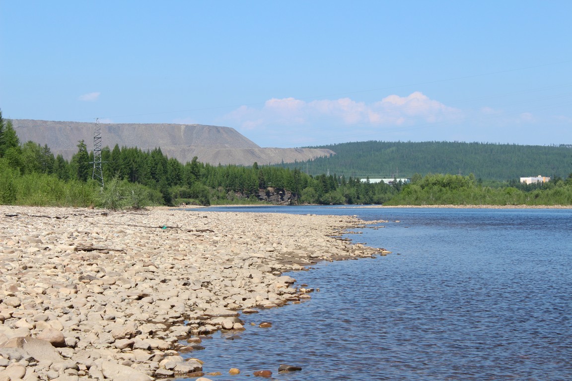Река Чульман проходит через город и является местом массовых купаний жителей Нерюнгри. Ближе к мосту купается большая часть населения, чуть поодаль более одичалые нерюнгринцы, еще дальше купались хардболисты, а уж что происходит далее даже представить страшно – возможно именно там и обитают местные медведи. Дно у речки каменистое, заходить было удобно в тапочках, течение вполне уверенное, иногда может и снести. Воды примерно по пояс, а температура… пожалуй, это самое холодное, что было в Нерюнгри в эти дни.